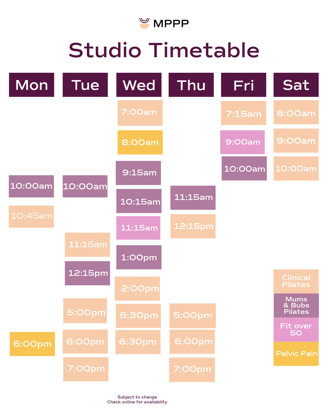 PRE ATTENDANCE REQUIREMENTS: Physio assessment to take history to understand injuries, goals, health status and safety of class attendance. If previously attended MPPP classes then no assessment is required.